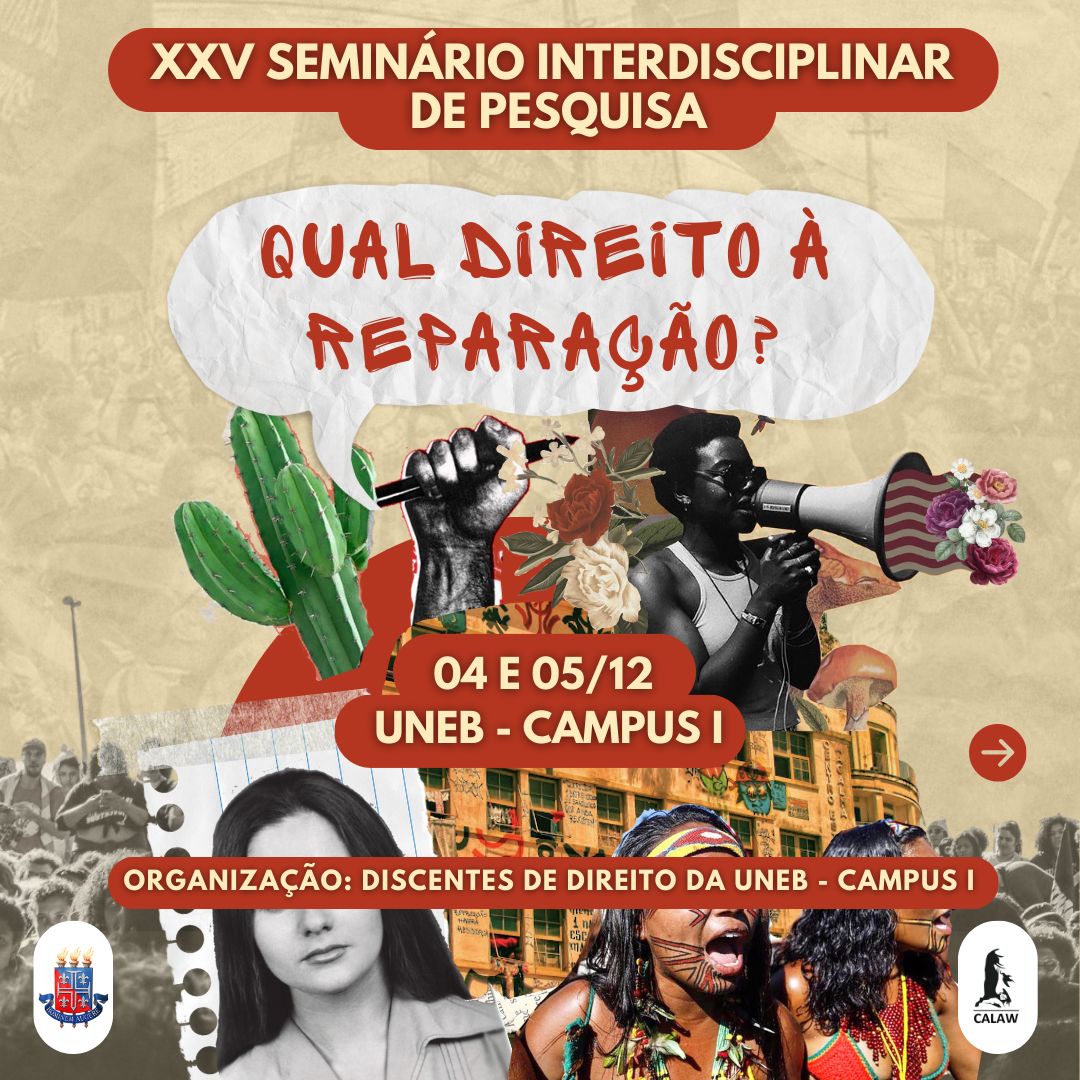 DCHI Inscrição - 24/11/2023 à 04/12/2023É com grande prazer que anunciamos a realização de mais um Seminário Interdisciplinar de Pesquisa (Seminter), do curso de Direito da UNEB - Campus I (Salvador), nos dias 4 e 5 de dezembro. A temática do XXV Seminter é "Direito e Reparação" e convidamos todas as pessoas da academia e da comunidade, para refletir e debater conosco as pesquisas desenvolvidas por discentes do nosso curso.