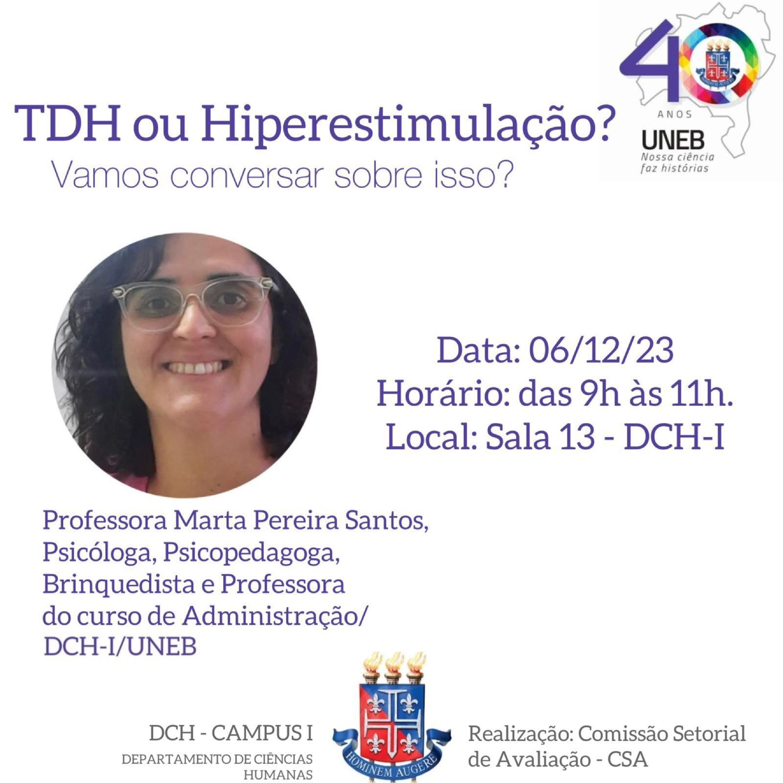 NUPE DCH I Inscrição - 27/11/2023 à 05/12/2023RODA DE DIÁLOGOS TDAH OU HIPERESTIMULAÇÃO? VAMOS CONVERSAR SOBRE ISSO? Realização: Comissão Setorial de Avaliação(CSA) do DCH I Data: 06/12/2023, de 9 às 11h Carga horaria: 02 horas