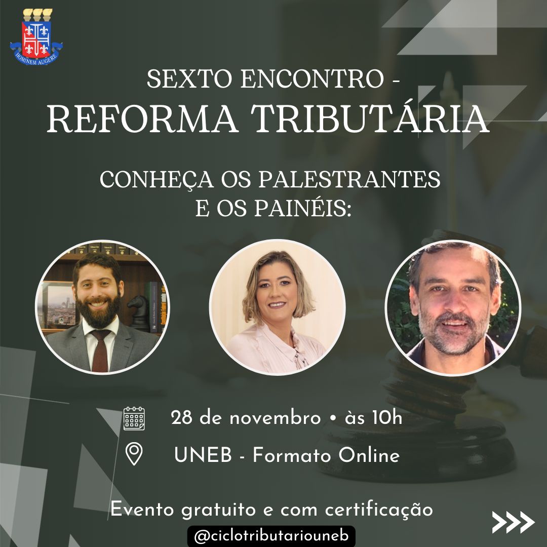 DCHI Inscrição - 27/11/2023 à 01/12/2023UNIVERSIDADE DO ESTADO DA BAHIA - UNEB DEPARTAMENTO DE CIÊNCIAS HUMANAS - DCH-I COORDENAÇÃO DO COLEGIADO DO CURSO DE DIREITO CENTRO ACADÊMICO LUIS ALBERTO WARAT - CALAW O colegiado de Direito do DCH-I, coordenado pela Professora Ainah Hohenfeld Angelini Neta, juntamente com o Centro Acadêmico de Direito Luis Alberto Warat (CALAW), realizará um ciclo de palestras (06 encontros) durante o período de 10 de outubro até 28 de novembro, onde serão tratados temas concernentes à Reforma Tributária. Cabendo ressaltar, a parceria com diversos palestrantes renomados na área em debate, tanto da UNEB, quanto de outras instituições. Entendendo que a Reforma Tributária é um tema de tamanha relevância e promotora de imensas mudanças no cenário tributário de nosso país - criando novas formas de cobrança de impostos, substituição de tributos e novas diretrizes para o governo - e que veio a provocar muitas discussões. Portanto, esses encontros virão a proporcionar a possibilidade de sanar e ajudar os discentes, não só de nossa universidade, mas todo o público interessado, colocando a UNEB numa posição de visibilidade e fomentadora de conhecimentos e debates produtivos. Desse modo, gostaríamos de contar com o apoio institucional do respectivo Colegiado, além da divulgação para o corpo discente, objetivando aderência e participação, nesses momentos de discussões e exposições sobre questões que podem ser de interesse não só do ramo jurídico, como também de outras áreas adjacentes. O evento será gratuito, com inscrição pelo SGE (Sistema de Gerenciamento de Eventos - UNEB), contando com certificação para os inscritos, podendo qualquer indivíduo vir a se inscrever. Destarte, a fim de garantir as informações dinâmicas do evento, informamos que o evento já possui uma página oficial no instagram (https://www.instagram.com/ciclotributariouneb/) @ciclotributariouneb, local que está sendo divulgada a programação das palestras. Por fim, já agradecemos todo o apoio e disponibilidade da Assessoria de Comunicação da UNEB, e nos colocamos à disposição para sanar as possíveis dúvidas, por meio dos e-mails: ciclotributariouneb@gmail.com; colegdireitocampus1@uneb.br. Link de acesso ao 5º Encontro: https://teams.microsoft.com/l/meetup-join/19:meeting_NjQzMzcwZTMtYjdhNy00NDYzLWE0NGUtMjNmMDdiNjJmZTIy@thread.v2/0?context=%7B%22Tid%22:%2272617dd8-37a5-42a2-8b20-59d2d0c50707%22,%22Oid%22:%2244ab65c7-2b77-4a75-ad47-cda246715015%22%7D