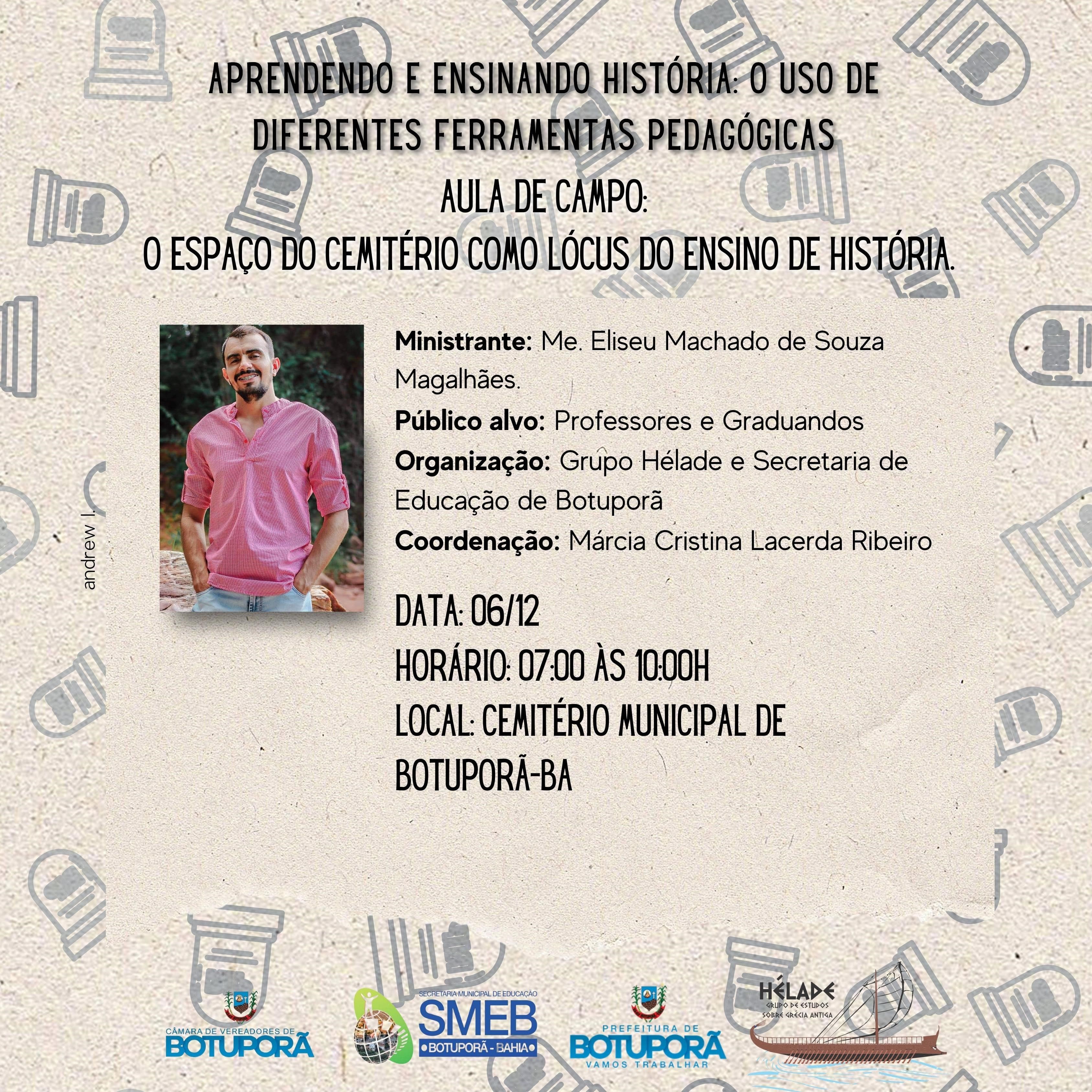 DCHVI Inscrição - 28/11/2023 à 07/12/2023Aula de campo: O espaço do cemitério como lócus do ensino de História A oficina pretende apontar alguns caminhos de como o cemitério, enquanto lugar de memória e patrimônio, pode se constituir em um espaço de ensino e aprendizagem para o ensino de História e de outras disciplinas a partir da exploração de temas – religião, organização do espaço e diferenciação social, poder e cultura. Atividade(s) do Evento: A oficina acontecerá através de uma aula de campo no cemitério municipal de Botuporã. Alunos de Caetité sairão de van para Botuporã às 6:00h. Local: Cemitério Municipal de Botuporã, Ba. Palestrante: Elizeu Machado de Souza Magalhães Professor responsável: Márcia Cristina Lacerda Ribeiro