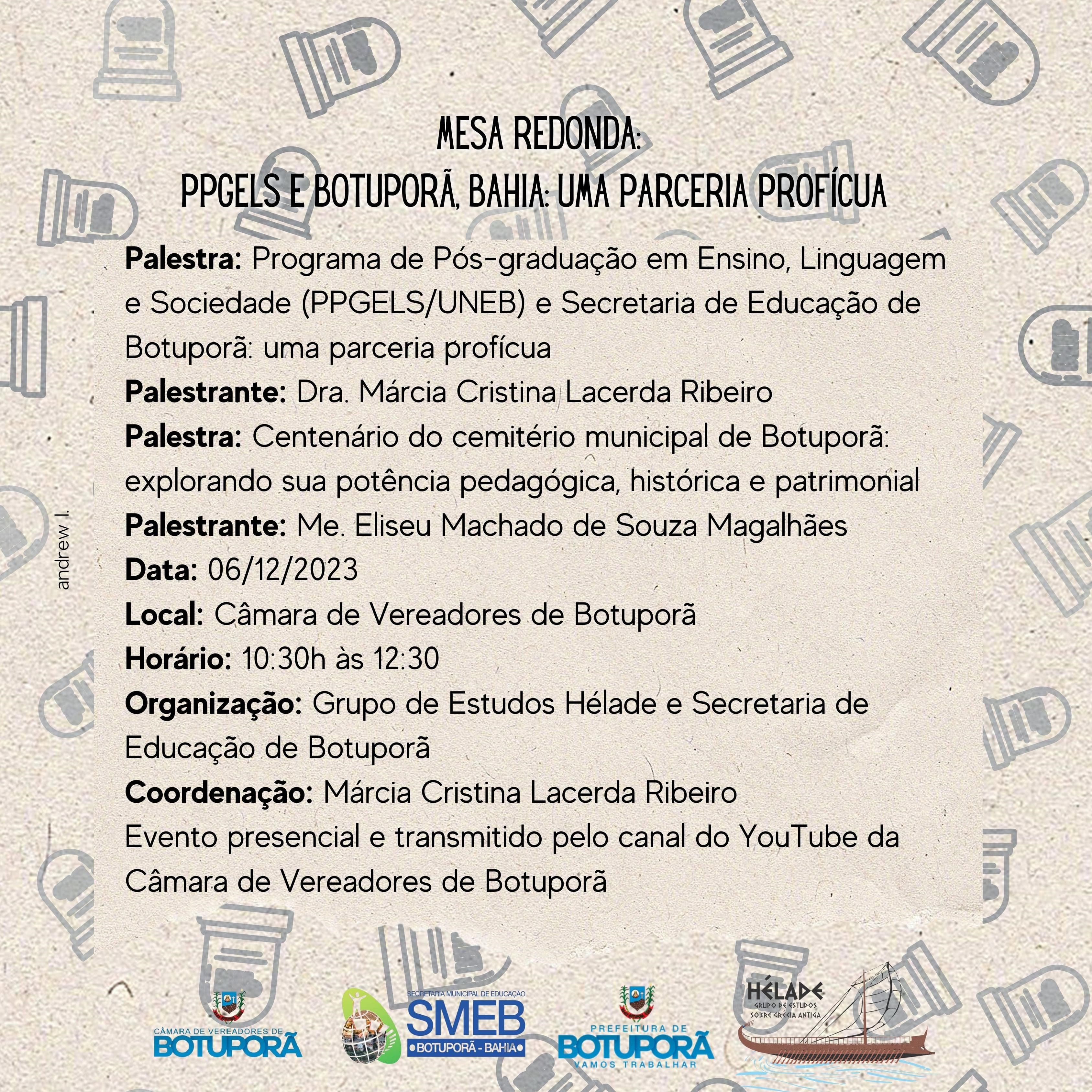 DCHVI Inscrição - 28/11/2023 à 07/12/2023Mesa redonda: PPGELS e Botuporã, Bahia: Uma parceria profícua A mesa pretende apontar os benefícios entre a parceria ocorrida entre o Programa de Pós-graduação em Ensino, Linguagem e Sociedade (PPGELS/UNEB) e o município de Botuporã-BA. A primeira palestra apresenta o Programa (PPGELS) e o trabalho do cemitério de Botuporã como alavanca para pesquisas futuras. A segunda palestra apresenta a pesquisa desenvolvida no PPGELS sobre o cemitério de Botuporã e as potencialidades para discutir patrimônio e história local. Atividade(s) do Evento: A mesa redonda contará com duas palestras. Tendo como palestrante a Dra. Márcia Cristina Lacerda Ribeiro com a temática sobre “Programa de Pós-graduação em Ensino, Linguagem e Sociedade (PPGELS/UNEB) e Secretaria de Educação de Botuporã: uma parceria profícua”, e a segunda palestra com a temática “Centenário do cemitério municipal de Botuporã: explorando sua potência pedagógica, histórica e patrimonial” com o palestrante Me. Eliseu Machado de Souza Magalhães. Local: Câmara de Vereadores de Botuporã Palestrante: Márcia Cristina Lacerda Ribeiro e Eliseu Machado de Souza Magalhães Coordenação: Márcia Cristina Lacerda Ribeiro