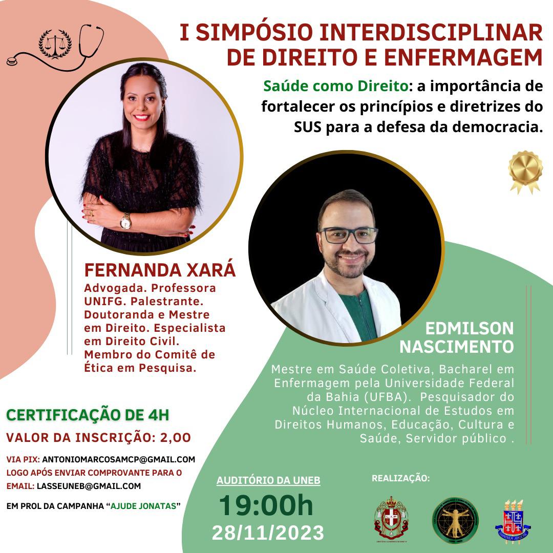 DEDCXII Inscrição - 16/11/2023 à 28/11/2023O I Simpósio de Direito e Enfermagem, enquanto projeto dos Diretórios Acadêmicos de Direito e de Enfermagem, tem como objetivo principal apresentar aspectos da interdisciplinaridade entre os dois cursos do campus XII. A enfermagem lida diretamente com as pessoas e sua saúde, o Direito normatiza e regula as práticas quanto à saúde, sendo assim um evento como esse vem promover uma compreensão maior tanto de questões ligadas à saúde da pessoa humana quanto aos seus direitos legais como usuários do Sistema Único de Saúde. A enfermagem e o Direito apesar de serem duas áreas diferentes estão intrinsecamente ligados, principalmente no que tange o cumprimento de leis e regulamentos relacionados a práticas da enfermagem. Além disso, tanto os futuros enfermeiros quanto o público precisam estar atualizados das mudanças nas leis e regulamentos que estão ligados a sua função diante da saúde. A prática da enfermagem muitas vezes envolve questões éticas e legais complexas. Um Simpósio Interdisciplinar durante a formação faz então com que ocorra a troca de conhecimento e principalmente de informações entre o alunado dos dois cursos e do campus como um todo. O evento será realizado em dois grupos de apresentações, um relacionado à Enfermagem e outro relacionado ao Direito, conforme abaixo descrito, envolvendo participação de discentes dos referidos cursos e outros profissionais convidados pelos DAs. Enfermagem • A importância de fortalecer os princípios e diretrizes do SUS para a defesa da democracia (convidado); • Participação social no contexto do SUS (Tema de Alexandre - Curso de Enfermagem). Direito ; • A importância de fortalecer os princípios e diretrizes do SUS (Tema de Fernanda Xará - Docente de Direito) • Direito à saúde da pessoa com deficiência (Tema de Ana Carolina - Curso de Direito) • Direito à saúde e comunidade LGBTQIA+ (Tema de Gabrielle - DA de Direito) Obs. As inscrições só serão validadas mediante o envio do comprovante pix para o email: lasseuneb@gmail.com Número pix email: antoniomarcosamcp@gmail.com