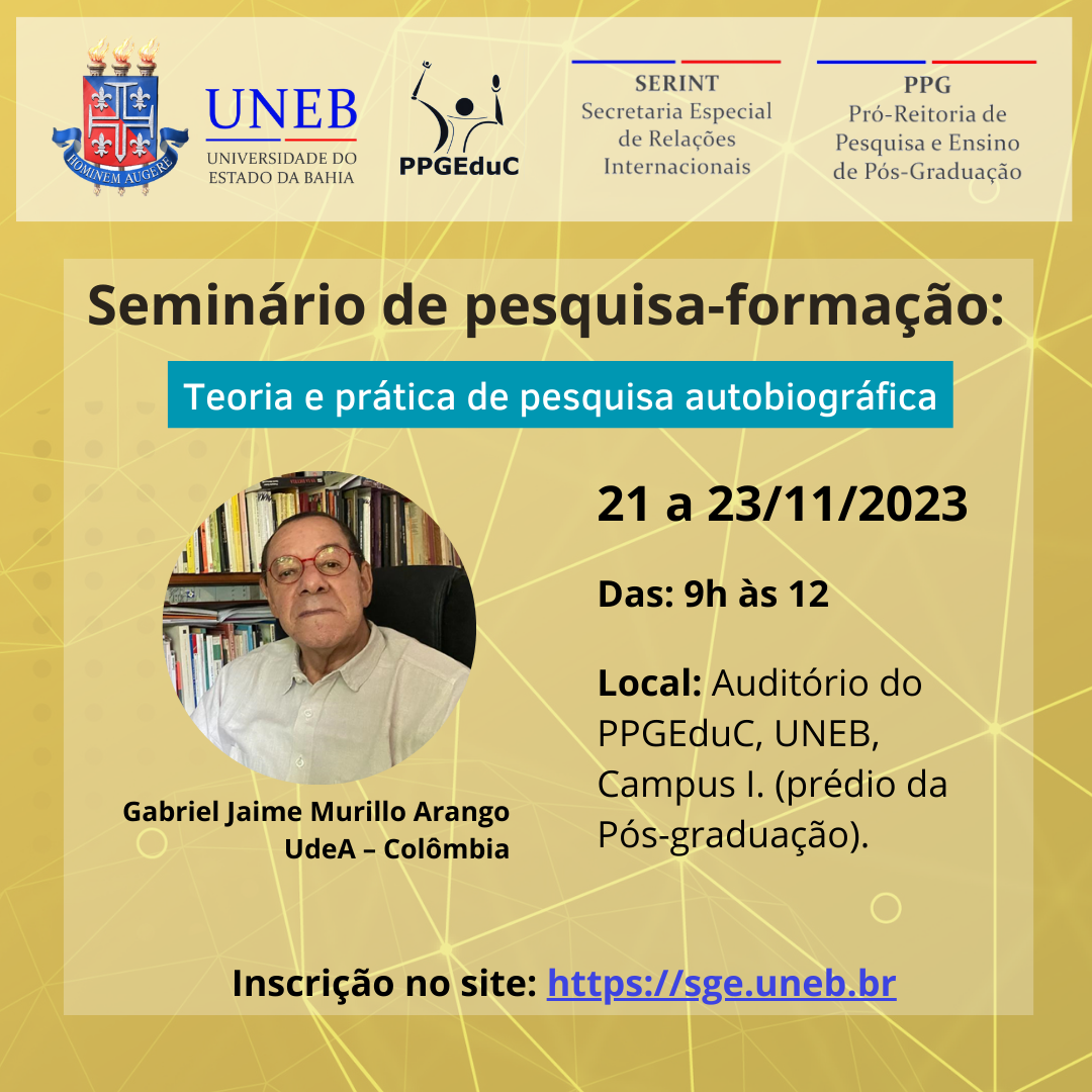 SERINT Inscrição - 16/11/2023 à 21/11/2023O Seminário de pesquisa-formação: teoria e prática de pesquisa autobiográfica, com o Prof. Dr. Gabriel Jaime Murillo-Arango da Universidade de Antióquia (Colômbia), acontecerá no Programa de Pós-Graduação em Educação e Contemporaneidade (PPGEduC) da Universidade do Estado da Bahia (UNEB), como ação previstas do Programa de Professores Pesquisadores Visitantes (PROFVISIT), no âmbito do edital 091/2023. Quando? Dias: 21, 22 e 23 de novembro, das 9h às 12h. Onde? No Auditório Milton Santos, localizado na Universidade do Estado da Bahia, rua Silveira Martins, 2555, Cabula – Salvador/Ba. (prédio da Pós-graduação) Público-alvo: Docentes (internos e externos), discentes de Pós-graduação e Pesquisadores.