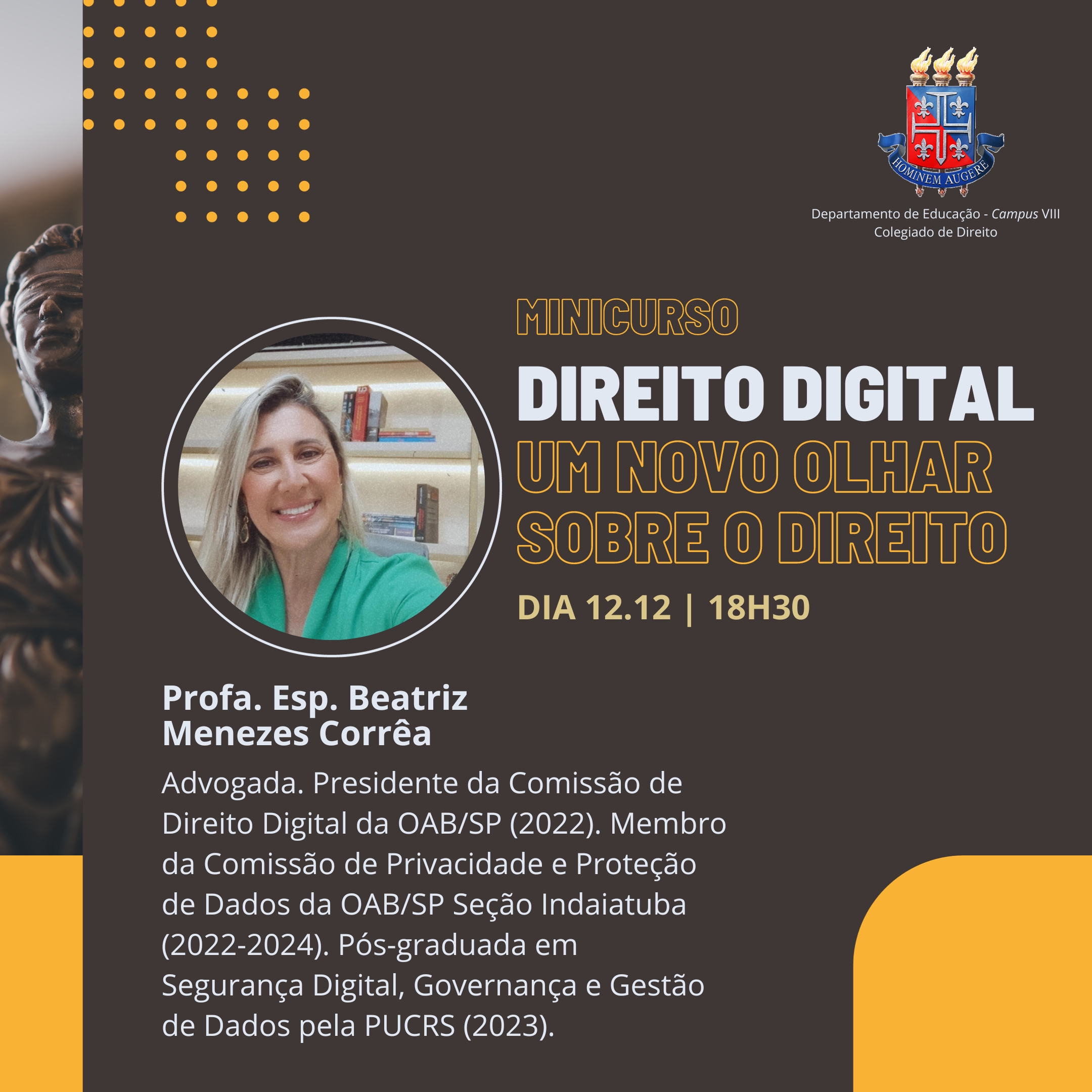 DEDCVIII Inscrição - 20/11/2023 à 11/12/2023Desde os anos 1990, notadamente, após a expansão da internet, fez-se necessário tratar de forma estruturada da disciplina Direito Digital. De lá pra cá, cresceu em importânica e relevância, demandando uma gama de conhecimentos transciplinares, pois aborda diferentes dimensões e aspectos da sociabilidade e relações jurídicas contemporâneas e cotidianas dos cidadãos. Nesse sentido, é preciso dar atenção aos aspectos e temas debatidos pelo Direito Digital, em especial, ante o Marco Civil da Internet e a Lei Geral de Proteção de Dados Pessoais. MINISTRANTE Beatriz do Socorro Menezes Corrêa é advogada. Pós-graduada em Segurança Digital, Governança e Gestão de Dados pela Pontifícia Universidade Católica do Rio Grande do Sul - PUCRS (2022). Pós-graduada em Advocacia Cível pela Faculdade de Direito da Fundação Escola Superior do Ministério Público – FMP (2023). Pós-graduanda em Prática Processual Penal pela Escola Mineira de Direito - EMD (2023-2024). Presidente da Comissão de Direito Digital, Proteção de Dados e Privacidade – OAB/SP (2022). Membro da Comissão Especial de Privacidade e Proteção de Dados, OAB/SP – Subseção Indaiatuba (2022 a 2024). DATA: 12.12.2023 HORÁRIO: 18:30 CARGA-HORÁRIA: 5 h/a. MODALIDADE: Remota
