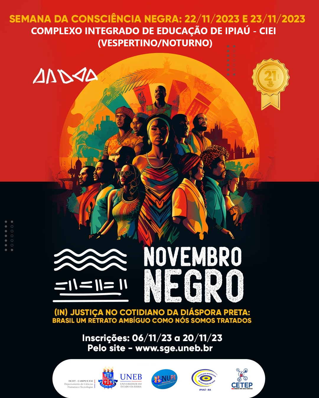 DCHTXXI Inscrição - 06/11/2023 à 20/11/2023Neste ano de 2023, o NOVEMBRO NEGRO tem por tema SOCIEDADE E JUSTIÇA e título (IN) JUSTIÇA NO COTIDIANO DA DIÁSPORA PRETA: BRASIL UM RETRATO AMBÍGUO COMO NÓS SOMOS TRATADOS. O evento tem objetivo de oportunizar o povo preto das comunidades, movimentos sociais e grupos organizados a falarem, “através do microfone aberto da Universidade”, sobre a violência a qual são alguns dos nossos irmãos. No curso das discutiremos os processos de criminalização primária e secundária, estruturação política estatal e jurídica no capitalismo, o racismo enquanto elemento estrutural da sociedade, bem como a construção do negro no imaginário social e persecução estatal contra os grupos racializados. A partir dos debates na presença de múltiplas representações sociais do extrato da sociedade local de Ipiaú, constataremos a necessidade de implementação de novas abordagens pragmáticas através dos diversos arcabouços teóricos dos pesquisadores negros e não negros, renomados, sobre a luta antirracista que está debruçada por todos que querem uma sociedade justa e menos violenta. Esperamos apresentar um aporte teórico crítico e análise de dados dos órgãos brasileiros acerca das estatísticas da atuação do sistema jurídico, bem como se busca compreender as dinâmicas nas quais se dão essas ações.