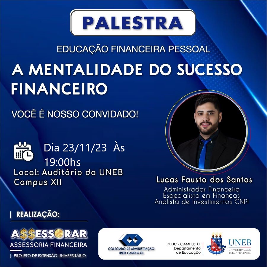 NUPE DEDCXII Inscrição - 09/11/2023 à 23/11/2023O projeto Assessoria em finanças: Educação financeira na prática tem o objetivo de esbouçar a temática em seus diversos campos de abrangência como: no âmbito de finanças pessoais, familiar e empresarial. Essa temática poderá impactar no desenvolvimento regional, pois desperta em todos os stakholders (alunos, professores, comunidade externa), o olhar e reflexão no que tange as finanças. O conhecimento da mesma, poder-se-á contribuir para a formação de cidadãos saudáveis, famílias menos endividadas e empresas melhor gerenciadas. O projeto implicará em mudanças de comportamentos e até mesmo desconstruirá conceitos deturbados sobre dinheiro. Ademais, o projeto também contribuirá de forma incisiva aos estudantes do curso de Administração do campus XII, pois confrontarão a teoria e prática de gestão financeira em seus diversos âmbitos; ainda o mesmo induzirá aos discentes um aprofundamento de pesquisas ligadas a essa temática, fazendo assim diferença tanto na formação acadêmica quanto social. Portanto, este projeto por sua vez, poderá ser uma intervenção eficaz na vida dos cidadãos e das organizações, fazendo com quem apliquem na prática a educação financeira. O projeto implicará no estudo teórico, no tange a educação financeira, e sinalizações práticas através de ciclo de palestras e roda de conversa. O estudo teórico acontecerá semanalmente, com a proposição de findar em um artigo. 1 ciclo de palestra e roda de conversa: Educação Financeira Pessoal: Desconstruindo conceitos e preconceitos sobre o dinheiro. 2 ciclo de palestra e roda de conversa: Educação Financeira Familiar: Praticando orçamento familiar 3 ciclo de palestra e roda de conversa: Educação Financeira Empresarial: gerenciando a gestão financeira da empresa. 4 ciclo de palestra e roda de conversa: Educação Financeira na perspectiva de investimentos. Roda de conversa acerca da Educação Financeira na comunidade externa