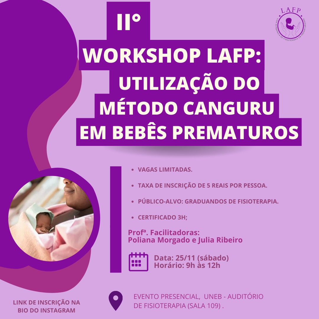 DCVI Inscrição - 09/11/2023 à 25/11/2023II° Workshop LAFP : Utilização do Método Canguru em bebês prematuros - Programação Teórico-pratico - Dia 25/11 - Horário: 9h as 12h - Local: UNEB - Auditório de Fisioterapia (sala 109) - Valor de inscrição: R$5,00 - 20 vagas Objetivo: Abordar a temática de Métodos de contato pele e pele em UTIN, com foco e objetivo maior de transparecer o conhecimento sobre o Método Canguru nos bebês prematuros, assim como seus benefícios nesse período, visando transmitir conhecimento teórico e prático.
