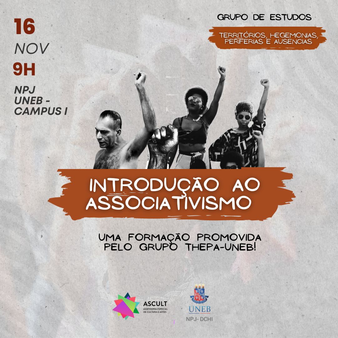 DCHI Inscrição - 10/11/2023 à 20/11/2023OFICINA INTRODUÇÃO AO ASSOCIATIVISMO. A oficina Introdução ao Associativismo decorre da necessidade de responder a demandas concretas de comunidades do Cabula. Tratam-se de demandas oriundas de coletivos diversos que, a partir de contatos com a Assessoria Especial de Cultura (ASCULT), chegaram aos Cursos do DCH1, especificamente Direito, Ciências Contábeis e Administração. A partir dessa primeira escuta sugeriu-se a realização de uma formação inicial, de modo que possamos dialogar sobre os caminhos possíveis que possam fazer frente às demandas dos coletivos. Oficina: Introdução ao Associativismo. Público alvo: lideranças comunitárias e estudantes. Data: 16/11/2023. Horário início: 9:00h Horário término: 12:00h Local: NPJ