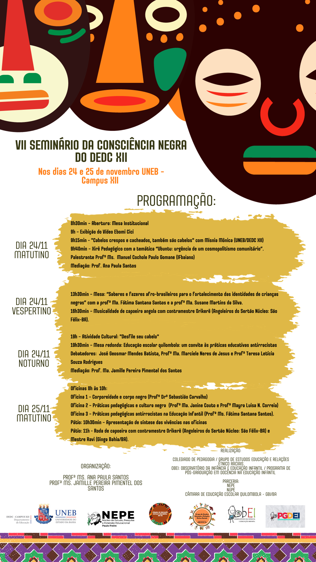 DEDCXII Inscrição - 14/11/2023 à 23/11/2023VII SEMINÁRIO DA CONSCIÊNCIA NEGRA DO DEDC XII - INSURGIR E (RE)EXISTIR Este projeto volta-se para a organização e realização do VII Seminário da Consciência Negra do DEDC XII, evento que possui em sua programação oficinas, mesas redondas com professores, professoras, estudantes da Uneb e da educação básica, movimentos sociais, lideranças quilombolas locais e da região, palestras, exposições, mesas, vivências, dentre outras ações afirmativas que possam contemplar as especificidades do público local. Ademais, é importante destacar, que o projeto dialoga com as atividades de ensino do componente curricular história e cultura afro-brasileira e indígena, como também, com as atividades da pós-graduação Latu Sensu em Docência na Educação Infantil. O intuito do Seminário é fomentar a reflexão sobre as questões étnico raciais no Brasil, discutir sobre o peso do racismo, dialogar no sentido de encontrar caminhos para se promover práticas pedagógicas antirracistas nas escolas, bem como, promover vivências afro centradas que exaltem a cultura, a estética e a história do povo negro na diáspora. O Seminário será presencial, nas dependências da UNEB - Campus XII, nos dias 24 (nos turnos matutino, vespertino e noturno) e 25 (no turno matutino) de novembro de 2023. A programação consiste em: atividades culturais, exposição "Venham ver a África!", palestra, mesas redondas, vivências e oficinas. O evento acontecerá nos dias 24 e 25 de novembro de 2023, de modo presencial, nas dependências da UNEB-Campus XII. § Pátio - 24/11 (matutino): 08:30 – Abertura com Mesa Institucional 09:00 – Apresentação do Vídeo Ebomi Cici 09:00 0 – Xirê Pedagógico com a temática “Ubuntu: urgência de um cosmopolitismo comunitário” com o professor doutorando Manuel Cochole Paulo Gomane (IFbaiano). Mediação: Prof. Ana Paula Santos 09:15 – Cabelos crespos e cacheados, também são cabelos” com Misnia Mônica § Auditório - 24/11 (vespertino): 13:30 às 16:00 – Mesa: “Saberes e fazeres afro-brasileiros para o fortalecimento das identidades de crianças negras” com as professoras Ms. Fátima Santana Santos e Susane Martins da Silva 16:30 – Musicalidade de capoeira Angola com o contramestre Orikerê (Angoleiros do Sertão Núcleo: São Félix-Ba) § Pátio de Auditório – 24/11 (noturno): 19:00 – Atividade Cultural “Desfile seu cabelo” 19:30 às 21:30 – Mesa redonda: Educação escolar quilombola: um convite às práticas educativas antirracistas Debatedores: José Geosmar Mendes Batista Prof. Marciele Neres de Jesus Prof. Teresa Letícia Souza Rodrigues Mediação: Prof. Jamille Pereira Pimentel dos Santos § Auditório, sala 13 e sala do laboratório de dança - 25/11 (matutino): · Oficinas 08:00 às 10:00: · Oficina 1 – Corporeidade e corpo negro (Profº Drº Sebastião Carvalho) · Oficina 2 – Práticas pedagógicas e cultura negra (articulada com a construção de bonecas Abayomi) (Profª Janine Couto e Profª Mayra Luisa N. Correia) · Oficina 3 – Práticas pedagógicas antirracistas na Educação Infantil (Profª Ms. Fátima Santana Santos). · Pátio: 10:30 – Apresentação de síntese das vivências nas oficinas · Pátio: 11:00 (Encerramento com roda de capoeira). · Beco das Artes: Exposição: Venha ver a África!