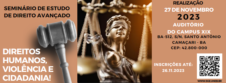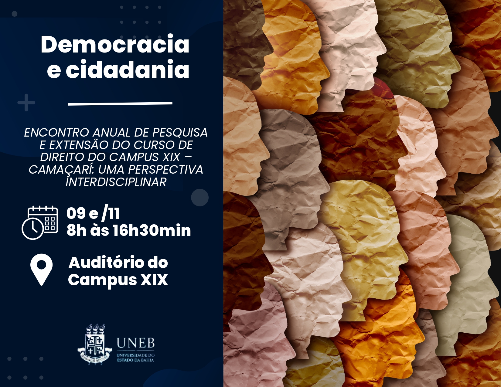 DCHTXIX Inscrição - 27/10/2023 à 11/11/2023ENCONTRO ANUAL DE PESQUISA E EXTENSÃO DO CURSO DE DIREITO DO CAMPUS XIX – CAMAÇARÍ: UMA PERSPECTIVA INTERDISCIPLINAR TEMA: Democracia e cidadania Data: 09 e 10 de novembro de 2023 Horário: 8h00min às 16h30min Local: Auditório do Campus XIX APRESENTAÇÃO O Seminário Interdisciplinar de Pesquisa é um componente curricular do Curso de Direito do Campus XIX e visa fomentar os debates na comunidade acadêmica da UNEB, e da comunidade do entorno, de temas contemporâneos de Direito e suas implicações no cenário jurídico nacional, bem como estimular a pesquisa. Visando atender aos objetivos da Universidade, as atividades do SEMINTER tem se voltado para a discussão dos problemas da comunidade de Camaçari e RMS e, nesta medida, também atende aos propósitos da atividade de Extensão . O Encontro anual de pesquisa e extensão do curso de Direito do campus XIX da UNEB-Camaçari é um projeto de extensão vinculado ao SEMINTER consistindo em comunicações orais dos artigos, elaborados pelos alunos do 2º ao 7º semestres e apresentados por seus autores. São retratadas questões de interesse na resolução, apontadas pela população da cidade sobre tema previamente escolhido. Coordenação: Prof. Kadja Parente PROGRAMAÇÃO 09/11/2023 8:30 – Abertura Composição da Mesa de Honra Execução do Hino Nacional Pronunciamentos 9:00 – Início das apresentações Mesa temática 01 - Educação Mesa temática 02 - Saúde 16:00 – Encerramento do dia 10/11/2023 8:30 – Abertura Mesa temática 02 – Direitos fundamentais Mesa temática 03 – Cidadania e acesso à direitos 16:00 – Apresentação cultural 16:30 - Encerramento do seminário