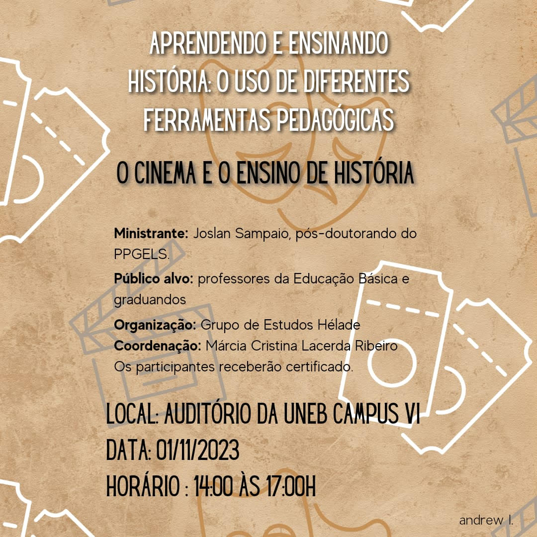 DCHVI Inscrição - 30/10/2023 à 01/11/2023O Cinema e o Ensino de História O objetivo da oficina é costurar a relação que cerca e orbita três pontos importantes: a história, a literatura e o cinema. A partir de obras audiovisuais como ponto de partida tenta compreender as especificidades históricas e socioculturais. Atividade(s) do Evento: Analisar como o cinema e a literatura condiciona uma (re)descoberta e (re)leitura de identidades socioculturais, incluindo, nesse caso, as identidades brasileiras. Palestrante: Joslan Sampaio Professor responsavel: Márcia Cristina Lacerda. Local: Auditório da UNEB campus VI.