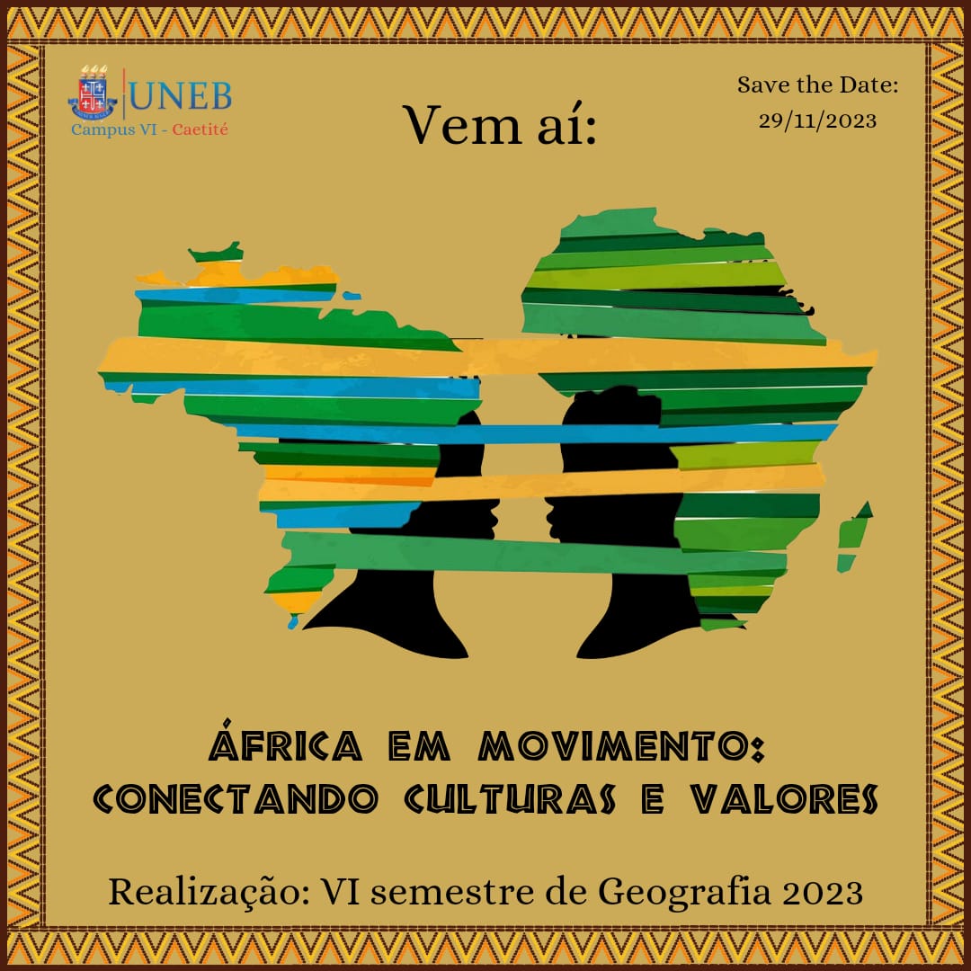 DCHVI Inscrição - 01/11/2023 à 29/11/2023África em Movimento: Conectando Culturas e Valores O África em Movimento: conectando culturas e valores é um seminário sobre peculiaridades da cultura afro-brasileira a realizar-se no Campus VI da Universidade do Estado da Bahia, na cidade de Caetité, encerrando atividades do Componente Curricular Geografia da África no semestre letivo 2023.2. Trata-se de um evento focado em evidenciar aspectos históricos e contemporâneos relacionados ao continente africano e a sua influência na formação do povo brasileiro. PROGRAMAÇÃO 13h30 - Abertura e credenciamento do evento com a participação da Diretora do Departamento, profª. Juliane dos Santos Amorim, a Coordenadora do Colegiado de Geografia, Profª. Núbia Maria de Brito e o Professor do componente, Profº. Dr. Manoel Alves de Oliveira. 14h - Mística. 14h40 - Mesa redonda: Lição ancestral: ancestralidade e meio ambiente (Èkó òkú òrun: ìrandíran àti eréko). Com: Prof. Msc. Bàbá Thonny Hawany (IFBAIANO Campus de B.J da Lapa). 15h30 - Lanche. 15h45 - Exposições e apresentações culturais. 16h40 - Mesa redonda: Leituras de África. Com: Profa. Dra. Zoraide Portela Silva (Campus VI da Uneb). 18h - Pausa. 19h - Mesa Redonda: Diáspora africana e identidade quilombola no Alto Sertão da Bahia. Com: Profa. Msc. Rosemária Joazeiro Pinto de Sousa (Campus VI da Uneb) e Profa. Letícia Rodrigues (Professora da educação básica de Guanambi). 20h - Apresentações culturais. 21h30 - Encerramento.