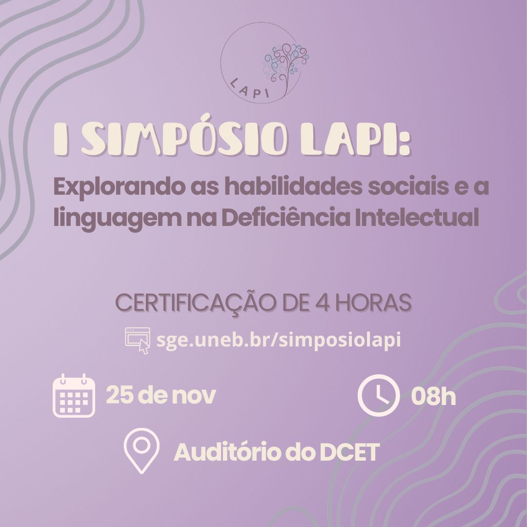 NUPE DEDC I Inscrição - 29/10/2023 à 26/11/2023A Liga Acadêmica de Psicopatologia Infanto-Juvenil (LAPI) da Uneb promove o "I SIMPÓSIO LAPI: Explorando as habilidades sociais e a linguagem na Deficiência Intelectual", onde busca transmitir os conhecimentos de Psicopatologia e Saúde Mental de crianças e adolescentes para o público interno e externo da Universidade do Estado da Bahia (UNEB), possibilitando assim debates e discussões acerca das temáticas apresentadas pelos palestrantes e convidados. Mais informações do projeto: Título do Evento: "I SIMPÓSIO LAPI: Explorando as habilidades sociais e a linguagem na Deficiência Intelectual" Data: 25/11/2023 Local: Auditório do DCET Duração: 8h - 12h (4h) Vagas limitadas.