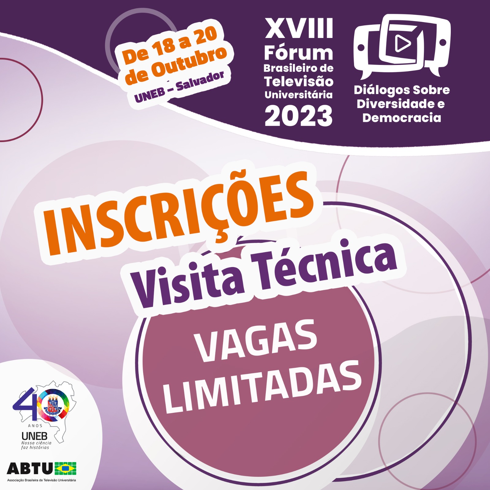 ASCOM Inscrição - 17/10/2023 à 18/10/2023ATENÇÃO! Inscrições abertas para visitas técnicas guiadas à emissoras de TVs baianas (Rede Bahia, TVE e TV Kirimurê). Dia: 19 de outubro Horário: 13h Observações: 1 - Vagas limitadas! 2- Cada participante só poderá escolher uma das emissoras. 3- As orientações gerais sobre essa atividade serão passadas para os inscritos posteriormente; 4 - A prioridade de participação nesta atividade é para os integrantes das caravanas do interior inscritas previamente no Fórum ABTU.