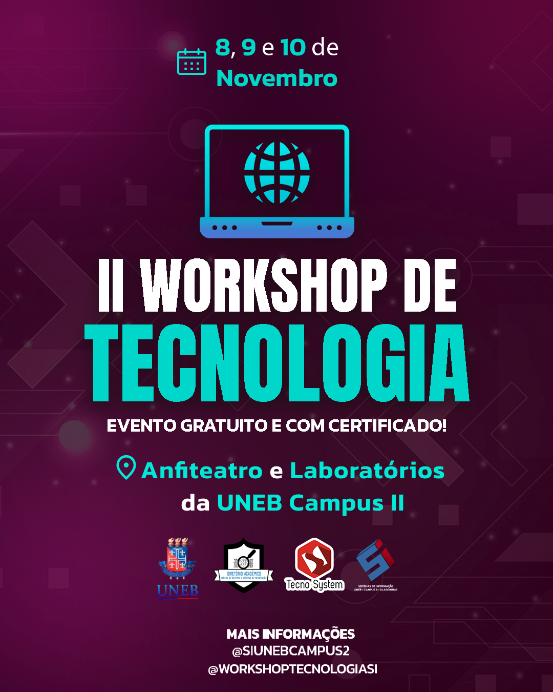 DCETII Inscrição - 23/10/2023 à 14/11/2023Evento presencial no Campus II - Alagoinhas-BA. II Workshop de Tecnologia Você gosta de tecnologia e desafios? Este evento foi feito para você! Pensando em você que gosta de tecnologia, desafios e quer ingressar ou se aperfeiçoar na área tecnológica e busca conhecimentos e perspectivas sobre o mercado de trabalho, nós, discentes do curso de Sistemas de Informação em conjunto com o colegiado do curso de Sistemas de Informação, idealizamos esse evento que acontecerá nos dias 08, 09 e 10 de Novembro de 2023. O I Workshop de Tecnologia foi realizado em 2018 e esta segunda edição foi planejada na disciplina Gerencia de Projetos, ministrada pela professora Cleide Tavares Bittencourt Santos. O evento é aberto a toda comunidade acadêmica e externa. Na programação contaremos com palestras, minicursos e hackathon, além de momentos de interação para deixar o evento dinâmico. Nosso objetivo é promover um momento de aprendizagem ativo e prático, reunindo pessoas que gostam da área tecnológica, incentivando o compartilhamento de conhecimentos e experiências, atividades práticas, desenvolver soluções criativas para problemas e desafios específicos, desenvolvimento de habilidades e promover a troca de ideias. Realize sua inscrição e venha com a gente nessa jornada de conhecimento!
