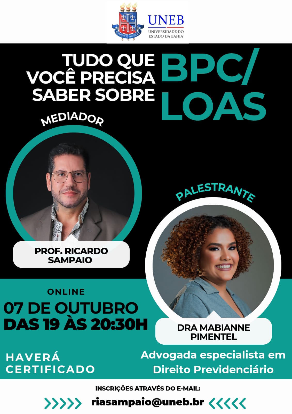 DCHI Inscrição - 06/10/2023 à 07/10/2023UNIVERSIDADE DO ESTADO DA BAHIA - UNEB DEPARTAMENTO DE CIÊNCIAS HUMANAS - DCH-I COLEGIADO DO CURSO DE DIREITO Palestra sobre o benefício de prestação continuada - BPC, prevista na LOAS. que será ministrada pela advogada Mabiane Pimentel, especialista em direito previdenciário e mediada por este professor Ricardo Sampaio. Nos últimos anos ocorreu um aumento da pobreza no Brasil. A Seguridade Social, prevista na Constituição Federal, prever mecanismo de amparo à velhice e à pessoa com deficiência, através do benefício de prestação continuada, no valor de um salário mínimo. Assim, é extremamente necessário que a população e, especialmente, os estudantes de direito, tenham acesso ao conhecimento deste mecanismos, que propicia a densificação do mínimo existencial.