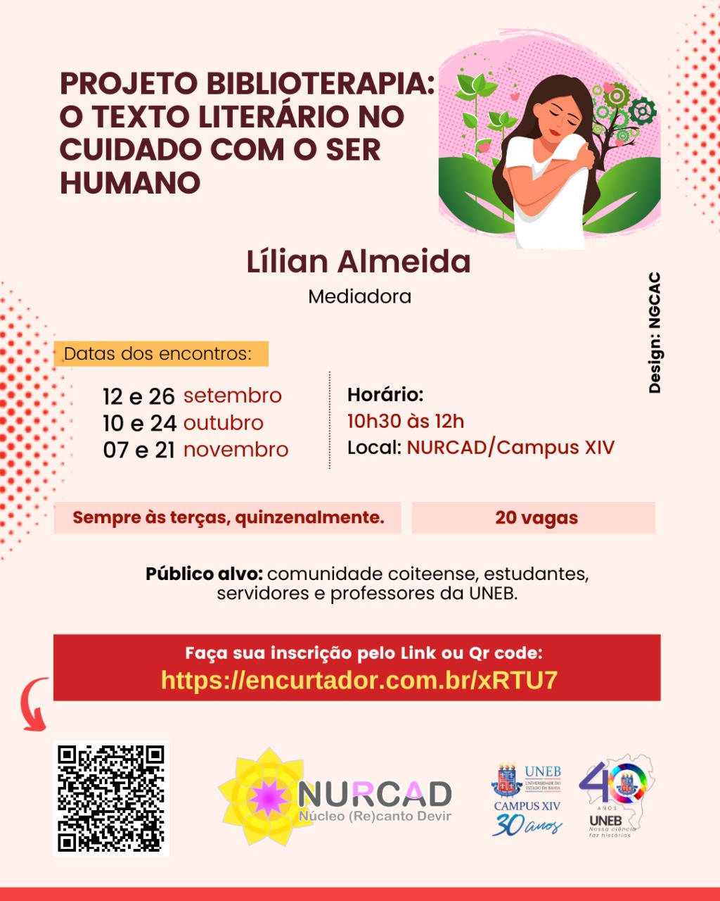 DEDCXIV Inscrição - 28/08/2023 à 18/09/2023A Biblioterapia consiste na escuta de textos com ouvidos e alma, aguçando a percepção dos próprios sentimentos e emoções. O projeto vivencial "Biblioterapia: o texto literário no cuidado com o ser humano" lhe convida a sentir o toque do texto literário como um momento de autocuidado. Os encontros acontecerão sempre às terças nos dias 12/09, 26/09, 10/10, 24/10, 07/11 e 21/11.(10:30 às 12h), quinzenalmente, junto ao Cajueiro, proporcionando maior bem estar em contato com a natureza. Campus XIV, Conceição do Coité. Receberão certificado de 9h, quem tiver 75% ou mais de presença. Se inscreva agora! "só há revolução quando há amor por nós mesmas." (Ryane Leão)