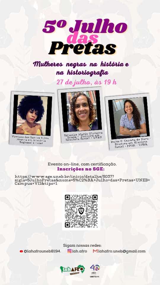 NUPE DEDCVII Inscrição - 22/07/2023 à 27/07/2023Prezadas/os/es, O dia *25 de julho* é instituído no Brasil pela Lei n° 12.987/2014 como o Dia Nacional de Tereza de Benguela e da Mulher Negra. Teve como inspiração, o 1° Encontro de Mulheres Negras da América Latina e do Caribe, em Santo Domingo, na República Dominicana, em julho de 1992, onde mulheres negras de 70 países se reuniram para debater o impacto do machismo e racismo na vida das mulheres negras em solo latino americano. Em alusão a esta data, o Laboratório de História e Cultura Afro-Brasileira e Currículo Mariinha Rodrigues (LahAfro), promoverá em sua 5ª edição o debate sobre *“Mulheres Negras na História e na Historiografia”* e contará com as participações da Dra. Edinelia Maria Oliveira Souza, da Ms. Viviane dos Santos Silva e da Ms. Raiza C Canuta da Hora. *Quando:* 27/07/2023 às 19h *Onde:* canal do YouTube LahAfro Uneb Evento on-line, gratuito e com emissão de certificado! *Inscrições:* https://www.sge.uneb.br/inicio/detalhe/5037?sigla=5JulhoPretas&nome=5%C2%BA+Julho+das+Pretas+UNEB+Campus+VII&tipo=1 Aguardamos vocês para um momento de partilha de saberes e afetos! #mulhernegra #julhodaspretas #lahafro