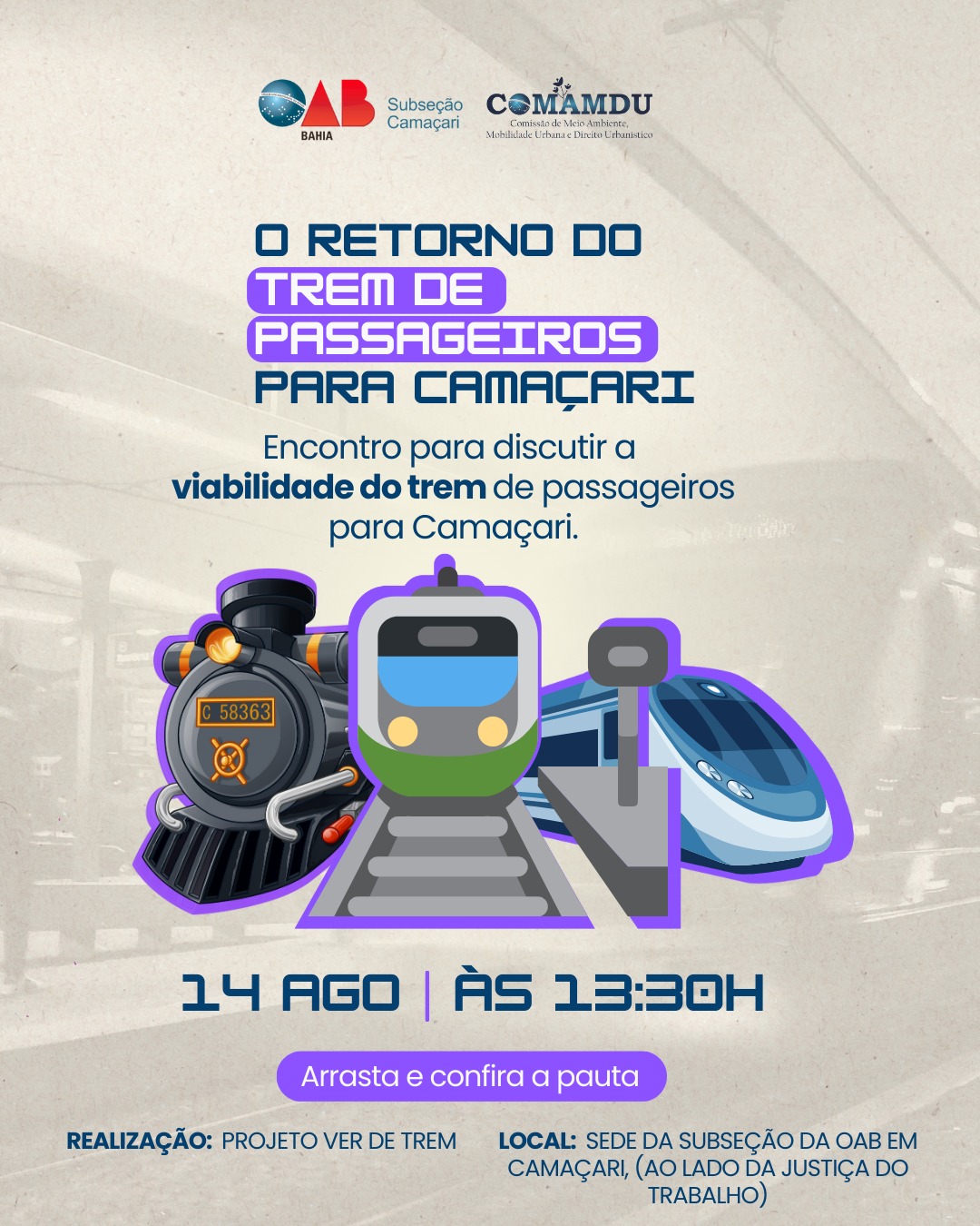 DCHTXIX Inscrição - 07/08/2023 à 14/08/2023Será apresentado por professores pesquisadores e por especialistas, um Painel Técnico e Propositivo, aos representantes dos municípios que compõem o referido trecho, aos representantes do poder público estadual, aos representantes da sociedade civil organizada e aos representantes de diversas empresas, que também anseiam pelo transporte de seus produtos e seus funcionários pela ferrovia Pauta do Encontro: 1) MESA 01 - Abertura e apresentação do Projeto Ver de Trem – Coordenação. 2) MESA 02 - Apresentação dos Estudos Trem Regional de Passageiros Salvador a Alagoinhas, pelos professores pesquisadores do CETRAMA/UFBA, o Estudo Acesso Ferroviário aos Portos, pelo executivo da USUPORT e comentários de especialistas. 3) MESA 03 – Representantes dos Municípios, Empresas, Autoridades, Ministério Público e Defensoria Pública. 05 - Encerramento: Leitura do Manifesto PELO TREM REGIONAL NA BAHIA – DOS PORTOS A ALAGOINHAS e ENCAMINHAMENTOS. O TREM é passado, é presente e é futuro. No momento, para nós, é investimento econômico, é trabalho, renda, lazer, turísmo e MOBILIDADE para pessoas e TRANSPORTE para cargas, além de uma substancial redução dos impactos negativos ao meio ambiente. A Bahia precisa revitalizar e modernizar sua ferrovia para fazer parte da integração nacional.