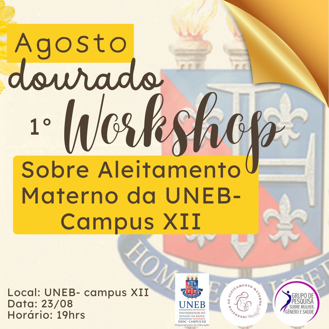 NUPE DEDCXII Inscrição - 10/08/2023 à 22/08/2023O 1° Workshop sobre Aleitamento Materno é um evento promovido pelo projeto de extensão incentivo ao aleitamento materno da UNEB campus XII, em comemoração a campanha do Agosto Dourado, e tem por objetivo promover o aprofundamento sobre a temática do aleitamento materno e melhorar a atuação dos estudantes e profissionais da área da saúde no aconselhamento e incentivo a amamentação. Forma de pagamento O pagamento de inscrição deverá ser feito por meio de Pix: Pix (Telefone): 77 998649068 O comprovante de pagamento deverá ser encaminhados para o E-mail: comissao1workshopaleitamento@gmail.com juntamente com identificação do nome completo do participante no corpo do e-mail. Confira a programação completa: 18:00 Credenciamento. 19:00 Abertura do evento/ História do Aleitamento Materno no Brasil. 19:40 Anatomia e fisiologia da Amamentação/ Composição do leite e apojadura. 20:10 Posicionamento e pega corretadas mamas pelo o bebê. 20:40 Complicação das mamas. 21:10 Hospital amigo da criança/ 10 Passos para o sucesso do Aleitamento Materno. 21:40 Habilidades de aconselhamento. Ao final teremos Coffe Break.