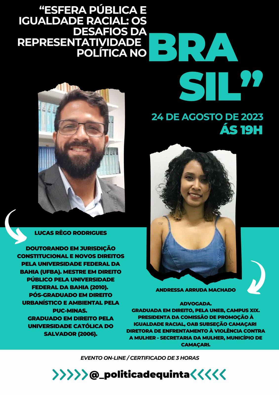 DCHTXIX Inscrição - 11/08/2023 à 25/08/2023Seminário “Esfera pública e igualdade racial: os desafios da representatividade política no Brasil” É com grande entusiasmo que convidamos você a participar do nosso Seminário sobre "Esfera Pública e Igualdade Racial: os desafios da representatividade política no Brasil". Este evento é uma das ações do projeto de extensão universitária "@_politicadequinta", desenvolvido pela Uneb Camaçari - DCHT-XIX, o qual tem por objetivo produzir conteúdo sobre educação política nas redes sociais, de forma acessível e sem direcionamento político-partidário. Este seminário imperdível acontecerá em 24/08/2023 às 19:00 e reunirá mentes engajadas, acadêmicos e pesquisadores para discutir o conceito habermasiano de esfera pública e sua relação com a igualdade racial como elemento da representatividade política em um ambiente democrático. Palestrantes: Prof. Lucas Rêgo Silva Rodrigues Doutorando em Jurisdição Constitucional e Novos Direitos pela Universidade Federal da Bahia (UFBA). Mestre em Direito Público pela Universidade Federal da Bahia (2010). Pós-graduado em Direito Urbanístico e Ambiental pela PUC-MINAS. Graduado em Direito pela Universidade Católica do Salvador (2006). Membro do Grupo de Pesquisa Direito, Sentido e Complexidade Social.- DSComplex/UFBA. Coordenador do grupo de pesquisa Discurso do ódio, fake news e a crise do constitucionalismo democrático na contemporaneidade/ Unijorge. Professor do curso de Direito da Unijorge. Membro Conselho Consultivo e Parecerista da Revista Seara Jurídica da Unijorge. Advogado. Consultor na área de Direito Urbanístico, com ênfase em regularização fundiária. Drª Andressa Arruda Machado Graduada em Direito, pela UNEB, campus XIX Presidenta da Comissão de Promoção à Igualdade Racial, OAB subseção Camaçari Diretora de Enfrentamento à Violência contra a Mulher - Secretaria da Mulher, município de Camaçari Detalhes do Evento: Data: 24/08/2023 Horário: 19:00 Local: Youtube do Política de Quinta: https://www.youtube.com/@politicadequinta8760 Serão certificadas 3 horas de ACC pela UNEB Atenciosamente, @_politicadequinta