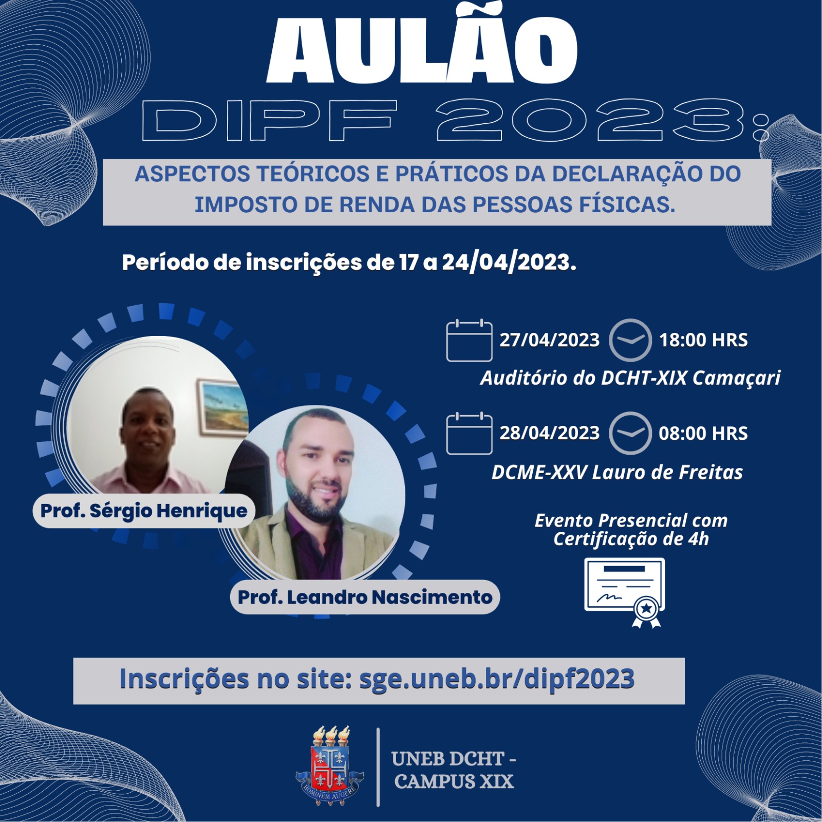 DCHTXIX Inscrição - 30/04/2023 à 30/04/2023Venha aprender acerca da dinâmica da tributação e preenchimento da declaração de imposto de renda das pessoas físicas (2023). Inscrições no período de 17 a 24/04/2023, escolha em qual data e local deseja participar EVENTO PRESENCIAL com certificação. Data: 27 de abril de 2023 (quarta-feira) às 18h (Auditório, DCHT-XIX Camaçari) Data 28 de abril de 2023 (quinta-feira) às 8h (DMCE, Lauro de Freitas)
