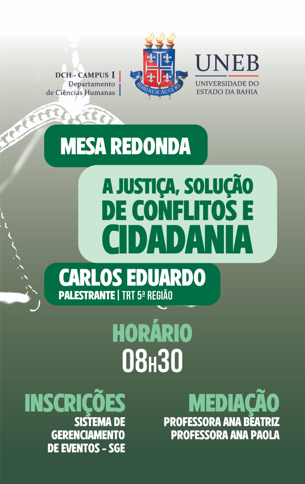 DCHI Inscrição - 19/04/2023 à 20/04/2023Evento realizado pelo Colegiado de Direito, Campus I, Salvador, em parceria com as docentes , Dra. Ana Beatriz Pereira e Des. ª Ana Paola Diniz, com o Centro Judiciário de Solução de Conflitos e Cidaddia (CEJUSC) da 5ª Região, e discentes do curso de direito. Objetivo: Discutir a mediação como método adequado de resolução de conflitos trabalhistas. Convidado: Carlos Eduardo - CEJUSC (5ª Região) Dia: 20 de abril de 2023 Local: Sala 5 - DCH I - UNEB Horário: 8:30h Público - alvo: Alunos do curso de Direito Certificação - 4h