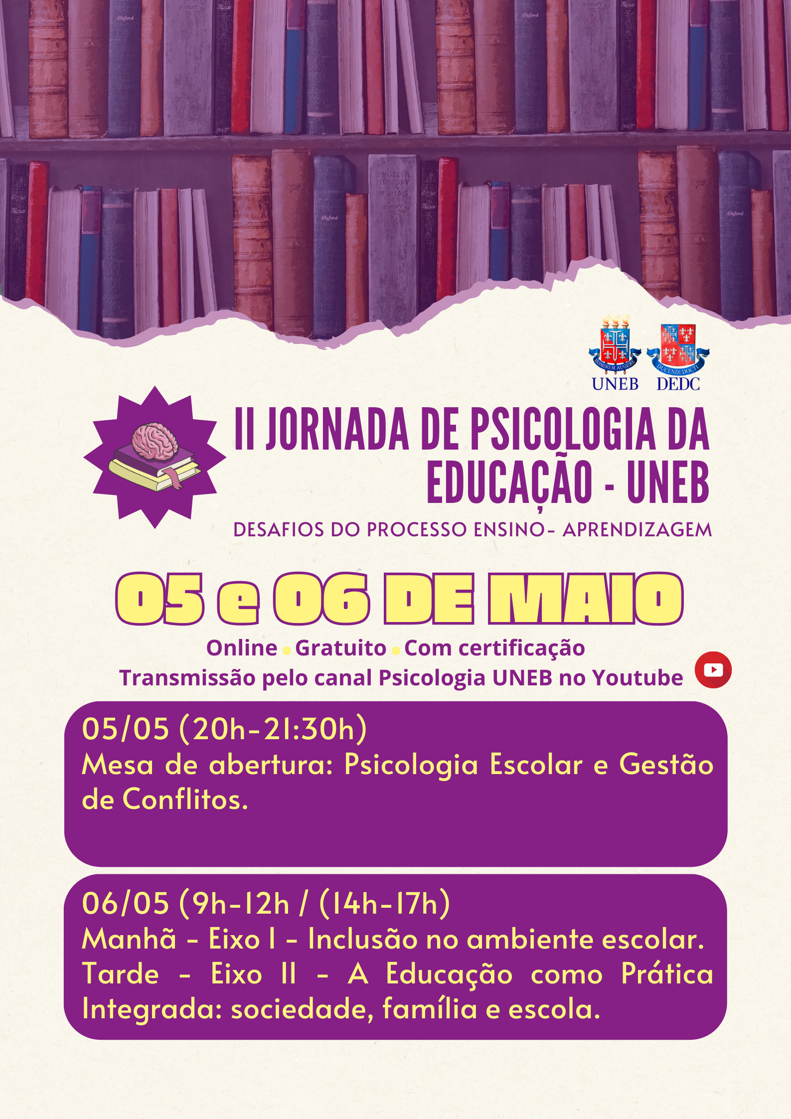 NUPE DEDC I Inscrição - 17/04/2023 à 05/05/2023Entendendo a educação como meio de transformação e inclusão social, faz-se necessário a promoção de diálogos que promovam intersecções entre a Psicologia e a Pedagogia. Nesse sentido, a “II Jornada de Psicologia da Educação da UNEB” tem como objetivo promover a discussão acerca das diversas nuances da Psicologia da Educação, a partir das produções e avanços da área no contexto atual. Para isso, o evento contará com a participação de profissionais que atuam com referenciais teóricos da construção de políticas públicas educacionais, práticas inclusivas na escola, transtornos de aprendizagem, tecnologias e processos de aprendizagem, abordagens metodológicas, entre outros. O evento, que tem como público alvo estudantes e profissionais de psicologia e pedagogia, pretende proporcionar reflexões acerca da Psicologia Educacional na atuação e produção profissional. Início do evento: 05/05 término do evento: 06/05 Horário; 05/05 - 20h às 21h30; 06/05 das 09h às 12 h e das 15h às 17h 300 vagas Carga horária 10 h