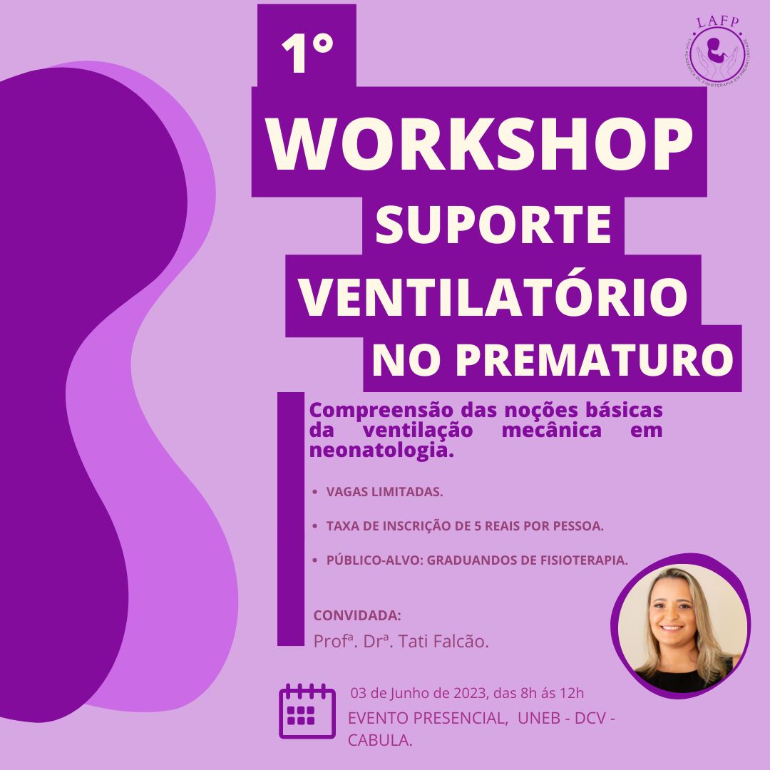 DCVI Inscrição - 01/05/2023 à 10/06/2023Com organização da Liga Acadêmica de Fisioterapia em Prematuridade da UNEB (LAFP) o workshop visa oferecer aos estudantes a oportunidade de ampliação e atualização dos seus conhecimentos técnico-científicos, de modo a otimizar a abordagem ao prematuro, aprimorando assim, os conhecimentos e treinando os princípios da assistência respiratória invasiva e não invasiva no prematuro. Será um encontro presencial na UNEB, campus Cabula, Salvador - BA. Ministrado pela Profa. Dra. Tati Falcão com a participação da Profa. Carolina Oliveira. Emissão de Certificado de 4hs