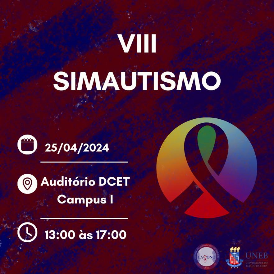 DCVI Inscrição - 09/04/2024 à 25/04/2024O 8o Simpósio sobre Autismo da UNEB ocorrerá no dia 25 de abril de 2024 com palestras e mesas com temas de interesse para estudantes e profissionais da Fonoaudiologia. Esse ano, o Simpósio ocorre em paralelo com a Semana em Defesa do SUS no Campus I da UNEB.